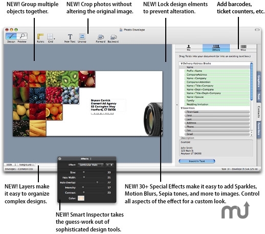 Labelist (was SOHO Labels) helps design and print professional labels, envelopes, and letterheads on your Mac. It's a complete design kit that includes 13,000+ designer graphics, 50 Bitstream commercial-grade fonts, and hundreds of ready-made designs. It supports over 1,500 label and envelope stocks including Avery, DYMO, APLI, and A-One. Print address, shipping, file folder, name badge, inventory, floppy disk labels and more. Supports 15 barcode formats including POSTNET, serial numbers, DYMO printers, Mac OS X Address Book, tab delimited files, and international addresses. Powerful design tools include 30+ shapes, 100+ image masks, 350+ fields, transparency, shadows, rotation, auto-text scaling, smart-guides, iPhoto integration and more.