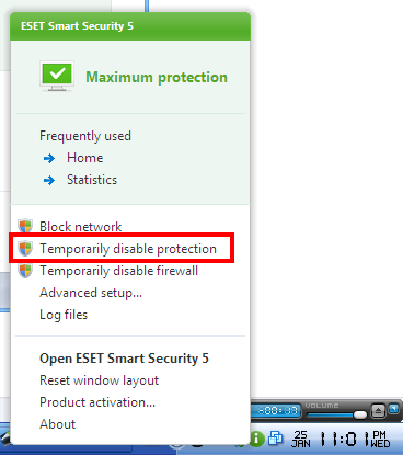 - If you have not installed tnode before unzipping the executable installer or tnode, first disable the virus protection by right clicking the ESET icon as shown in the picture: