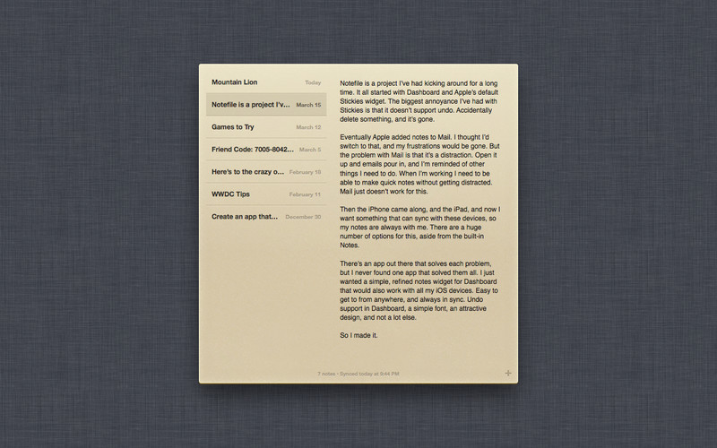 Notefile lets you make quick notes and view them quickly, from anywhere. It syncs with our iOS app for iPhone, iPad, and iPod touch, using iCloud or our own Junecloud sync.