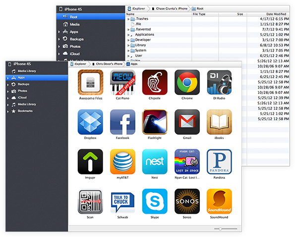 iExplorer (was iPhone Explorer) is an iPhone browser for Mac lets you view the files on your iOS device. By using a drag and drop interface, you can quickly copy files and folders between your Mac and your iPhone or iTouch. It works with both jailbreaked and non-jailbreaked iPhones and works quickly with a standard USB cable.