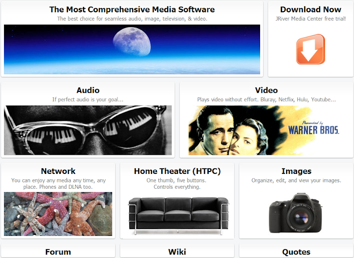 JRiver Media Center, the most comprehensive and seamless software available for managing and playing your media. Its scope includes almost all formats of audio, video, and images. Media Center can also record television and manage documents. And if you're looking for the best audio player or the best video player, you've found it. You can configure Media Center to focus solely on your needs.