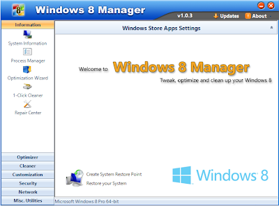 Yamicsoft Windows 8 Manager is a system utility that helps you optimize, tweak, repair and clean up Windows 8. It will increase your system speed, eliminate system fault, improve system security, and meet all of your expectations.Windows 8 Manager is a system utility that helps you optimize, tweak, repair and clean up Windows 8. It will increase your system speed, eliminate system fault, improve system security, and meet all of your expectations.